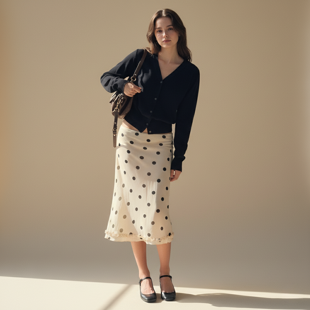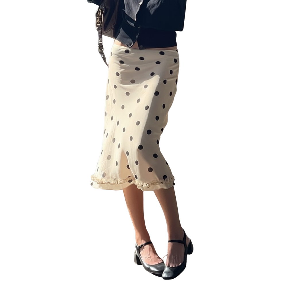 Eleganter Midi-Rock für Damen in Beige mit Polka-Dots und Rüschensaum – Vielseitige Streetwear für verschiedene Anlässe