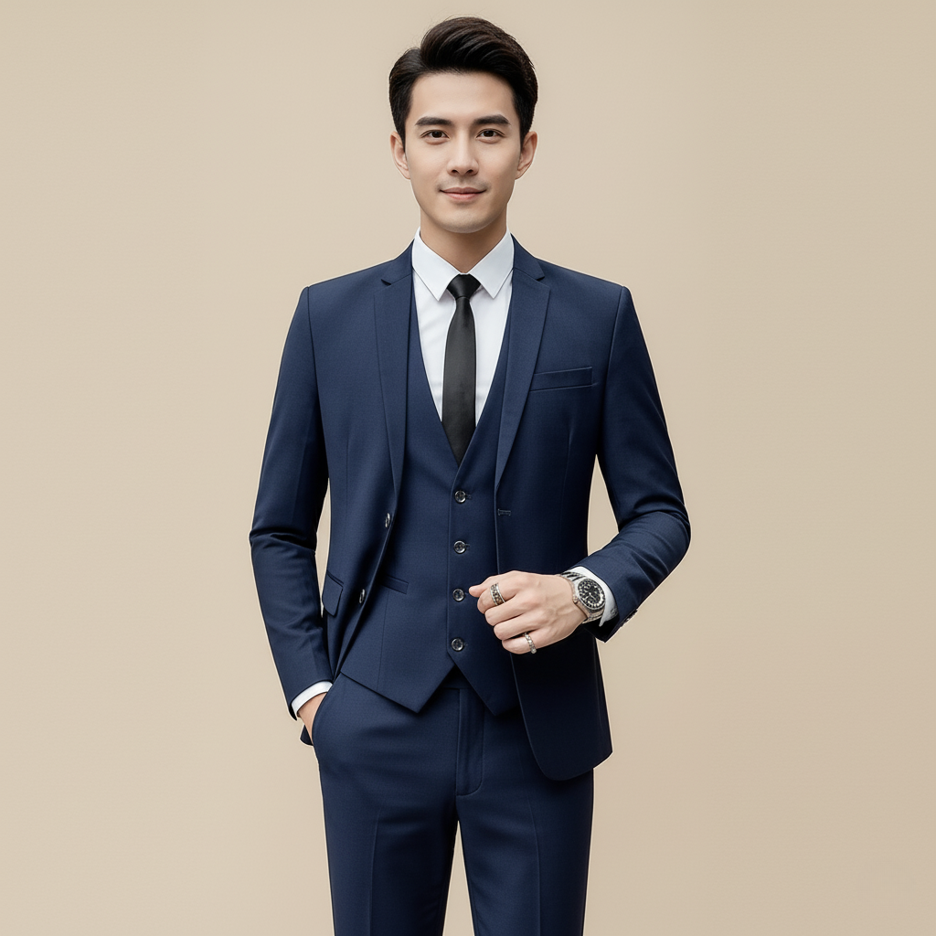 Dieser Anzug für Herren kombiniert Blazer, Weste und Hose in einem eleganten Design. Ideal für geschäftliche Anlässe, Hochzeiten oder formelle Veranstaltungen, bietet er sowohl Komfort als auch Stil.