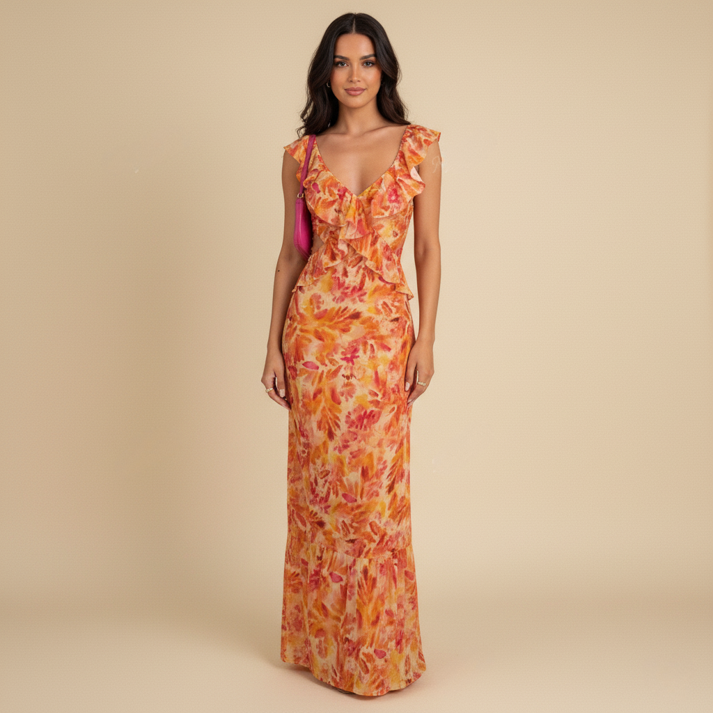 Maxikleid für Damen mit V-Ausschnitt und Rüschen – Elegantes Sommerkleid für Abendveranstaltungen und besondere Anlässe