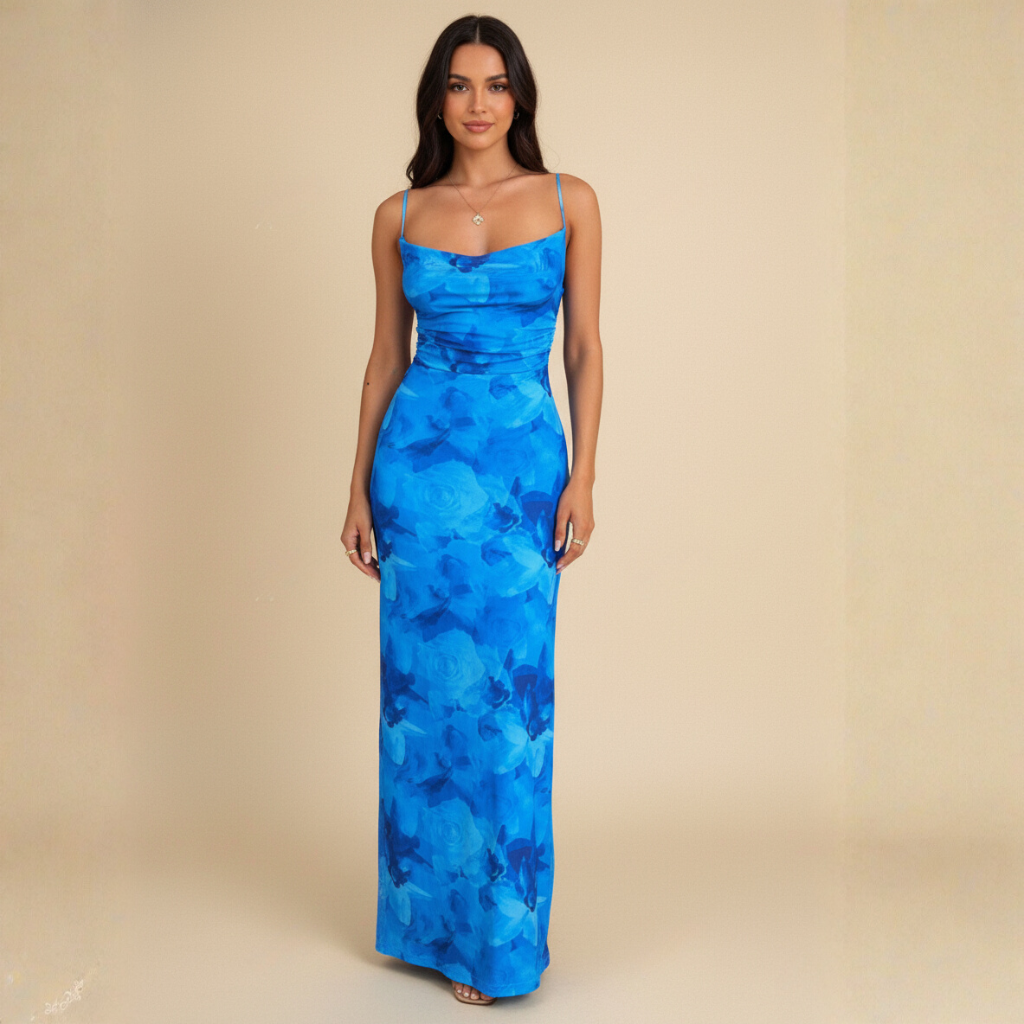 Maxikleid für Damen mit Spaghettiträgern – Elegantes Aquarellprint für Sommerabende und Festlichkeiten